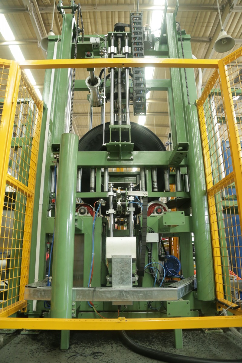 胎毛是輪胎生產過程的附加物,會對輪胎質量帶來很多問題。胎面的胎毛還會覆蓋住原有設計合理的胎面花紋,進而帶來排 水、摩擦力、制動性能等問題。汽車輪胎性能的安全性及可靠性越來越受到人們的關注。本機適用于子午輪胎硫化后胎面及胎側多余的膠毛,膠釘以及飛邊的修刮去除溢膠。本機臺是配合硫化機輸出裝置和入庫自動線之間,實現(xiàn)自動修邊的裝置。由輪胎投入、主機以及輪胎踢出裝置組成。通過在輪胎投入處檢測輪胎大小,仍后自動調整胎側、胎面修邊刀的位置,進行對輪胎修邊。其修后后一般在2mm以下,能滿足各輪胎的工藝要求;最后將輪胎推出,進入后續(xù)自動輸送線上。